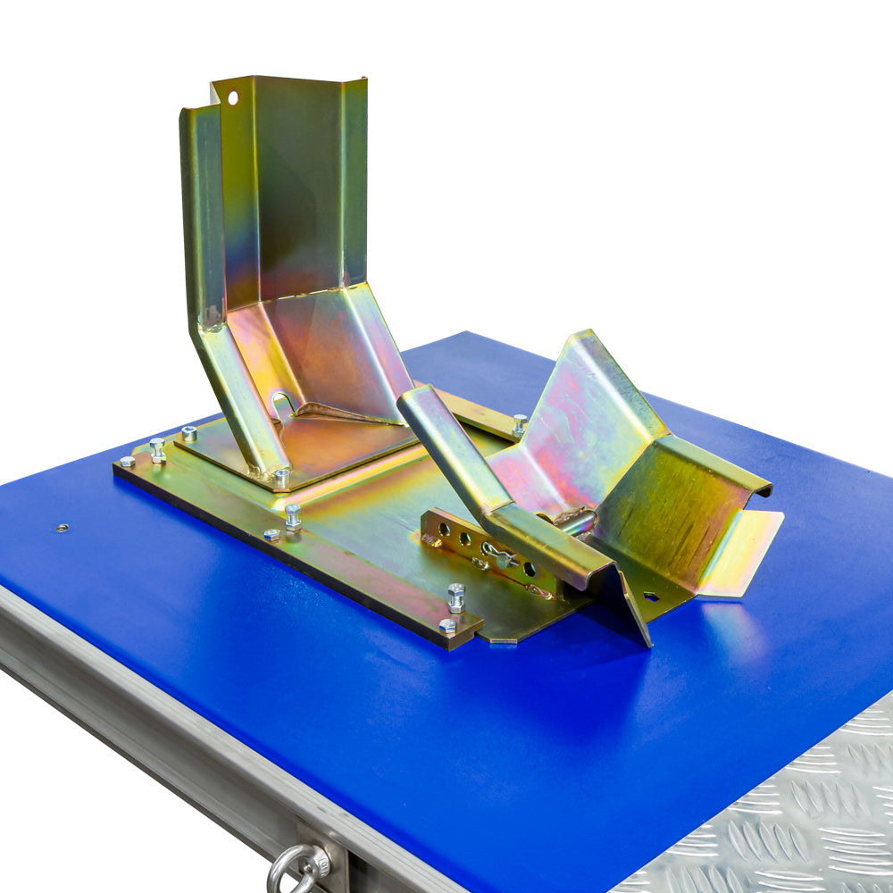 Deze Falco motorfietslift uit de premium lijn is ideaal voor professioneel gebruik in de werkplaats. De volledig inschuifbare oprijplaat bespaart ruimte, en de motor staat stevig vast in de automatisch vergrendelende voorwielklem. Aan beide zijden bevinden zich rvs goten met verschuifbare oogbouten om de motor eenvoudig met spanbanden te zekeren.